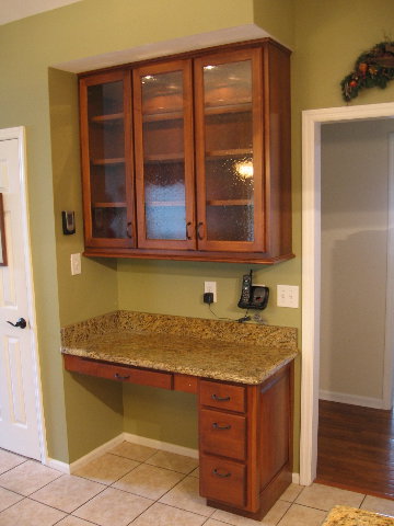 Added cabinet above desk and end panel on desk